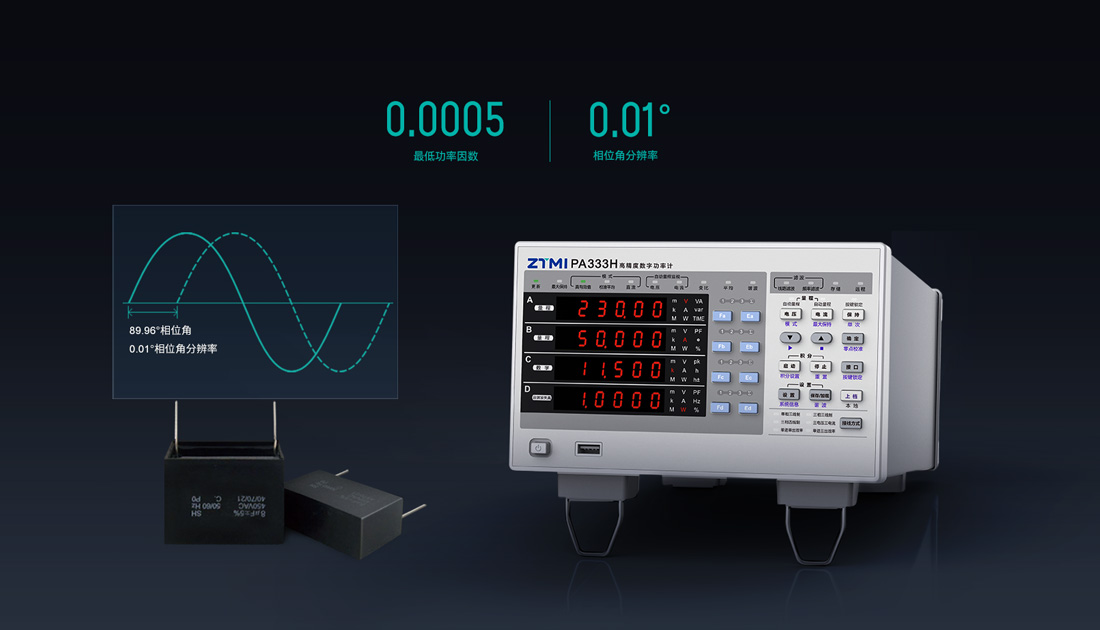 PA300系列数字功率计采用100MHz同步时钟,相角分辨率高达0.01°。即使在低至0.0005的功率因数下仍能保证0.1%的高测量精度。