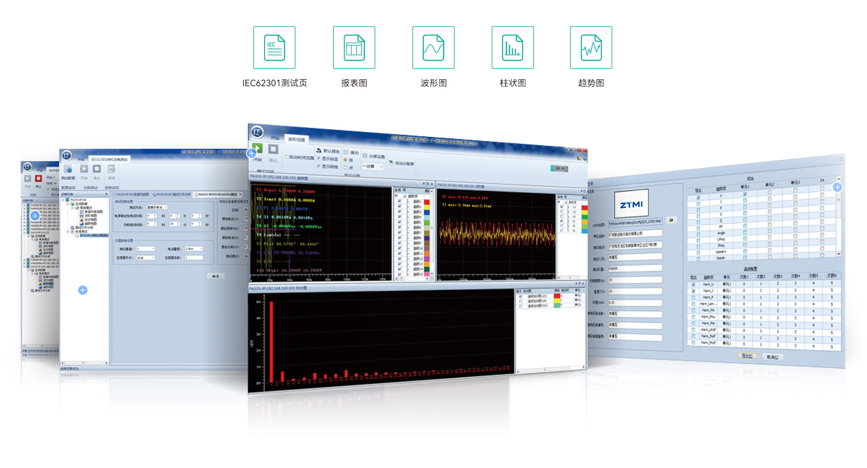 PAM管理软件具有强大的数据处理分析功能,支持对所有测量参数数值进行实时显示,生成各次谐波数据、谐波柱状图、趋势图和波形图,支持同步显示与报表导出。支持IEC62301国际测试标准,实现待机功耗的自动化测试。