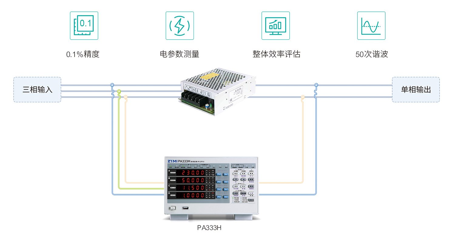 PA333H功率计三通道量程可单独设置,在测量单相电源时,可直接开启“单进单出”模式测量模块效率。而面对三相电源时,可以开启“单进三出”模式,轻松评估电源模块整体效率。
