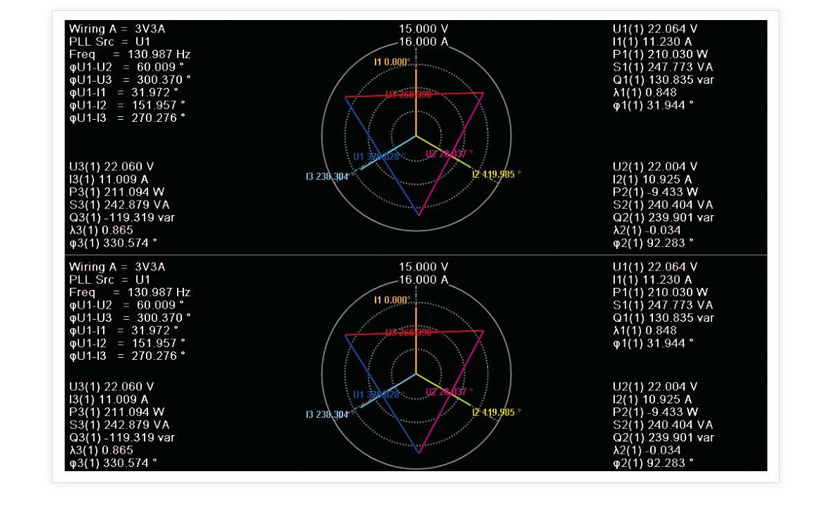 PA6000H功率分析仪可同时测量并显示变频器输入三相与输出三相的矢量图,可对输入、输出各相间的相角关系进行分析,准确评估出输入信号对输出信号的角差影响。