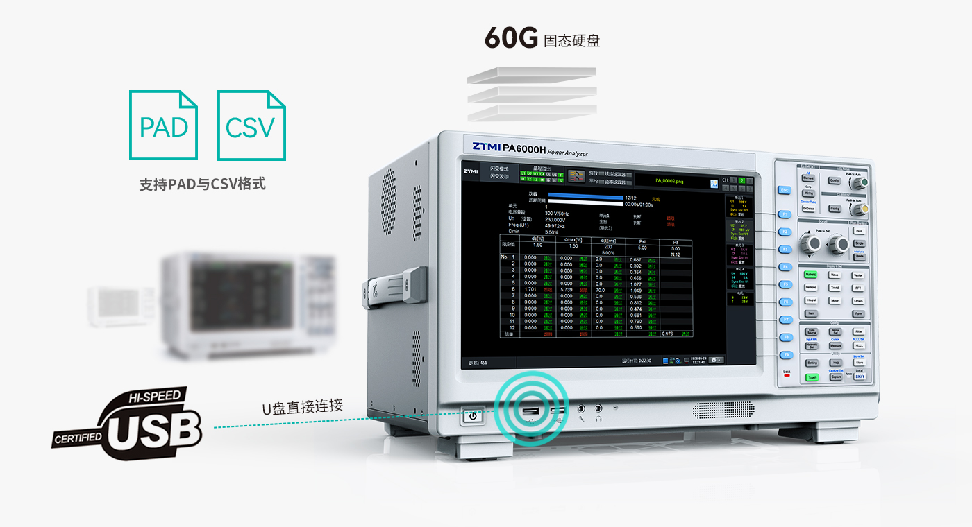 PA6000H功率分析仪拥有高达240G的固态硬盘可以海量存储数据,用户更可以直接连接U盘将想要的数据全部储存,PAD与CSV格式多样支持、存储时间随意控制,让存储再也不是难题。