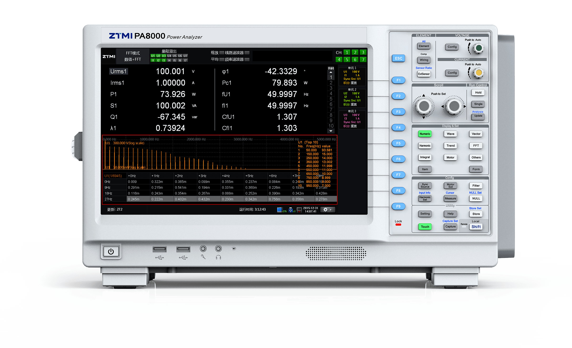 PA8000功率分析仪带宽为DC/0.1Hz‐5MHz,由于采用了PLL源倍频技术,可实现速度更快、动态范围更广的谐波测量,在谐波模式下可实现对电压、电流基波、功率、相位、谐波成分和总谐波失真因数(THD)的准确测试。