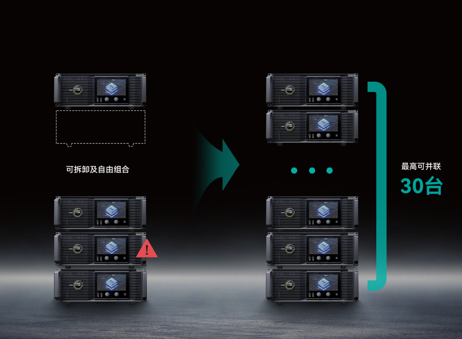 支持多机并联,最高可30台并机,采用数字控制方案,通过光纤进行系统通讯,并机后不需要再校准;并机数量及功率可自由组合,最大化产品利用率。