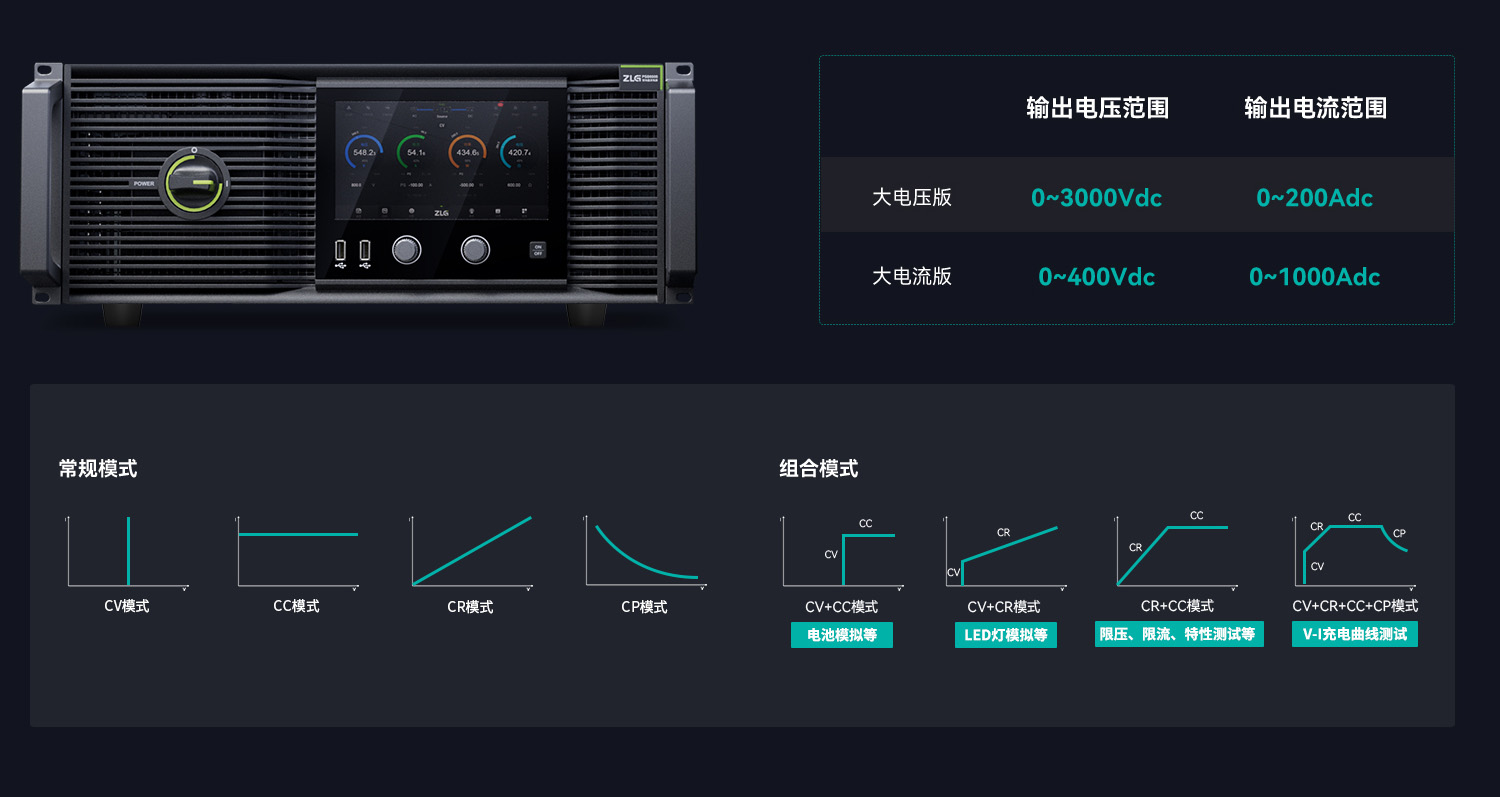 产品平台分为宽电压小电流、宽电流小电压两个系列,电压输出范围0~3000V,电流输出范围0~1000A;且源载双向均支持可编程输出,如CC、CV、CR、CP等,且支持多类型的输出模式组合。
