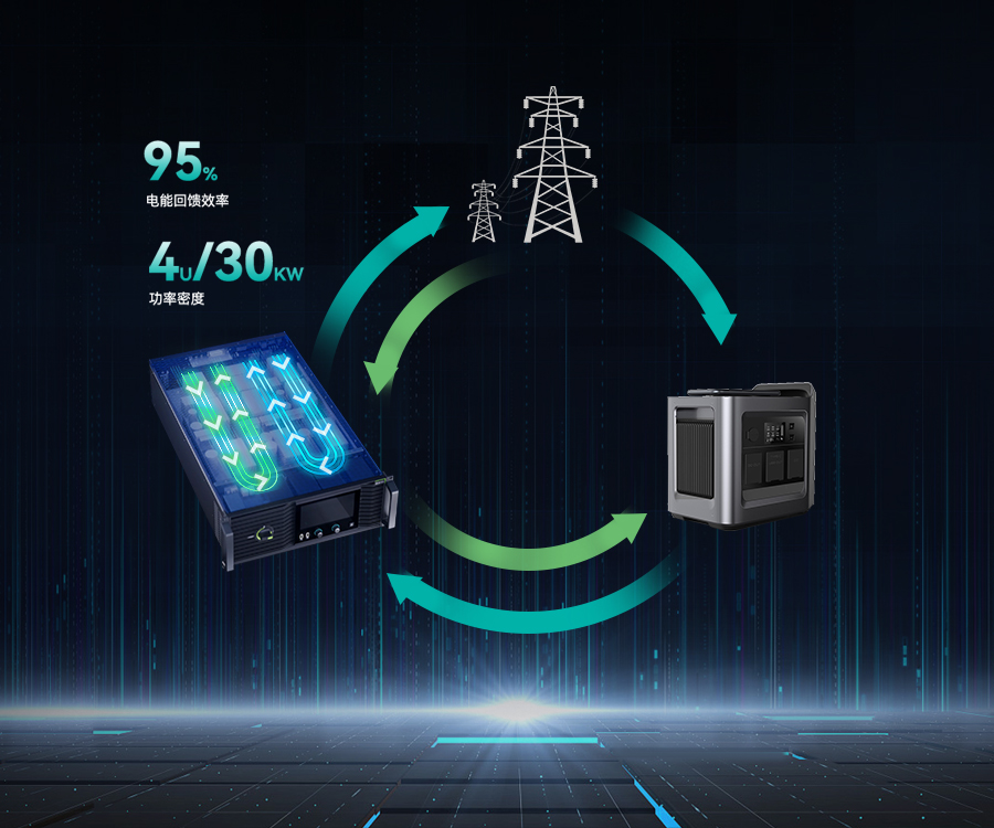 基于第三代半导体的电力电子能量变换技术,采用双向运行的多级功率拓扑结构,充分发挥功率器件的高压高频优势特性, 从而实现高达4U/30KW的功率密度,95%的电能回馈效率。