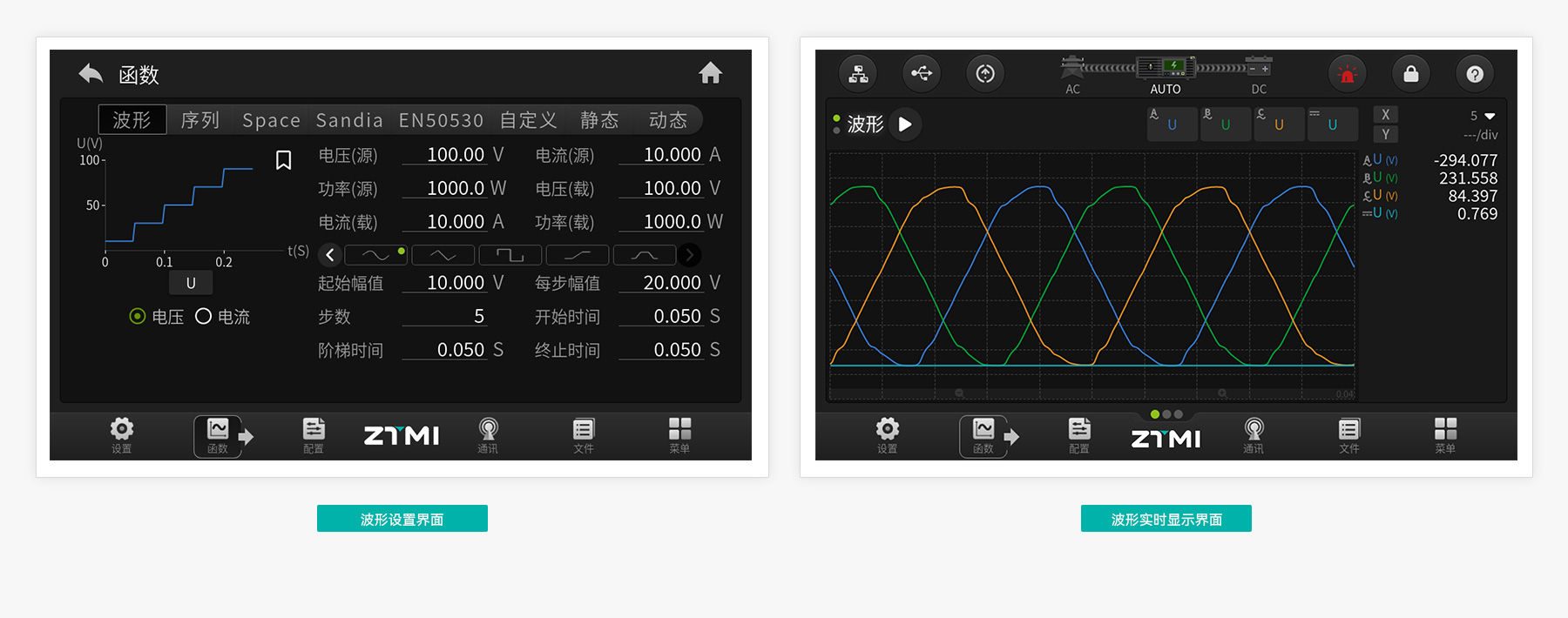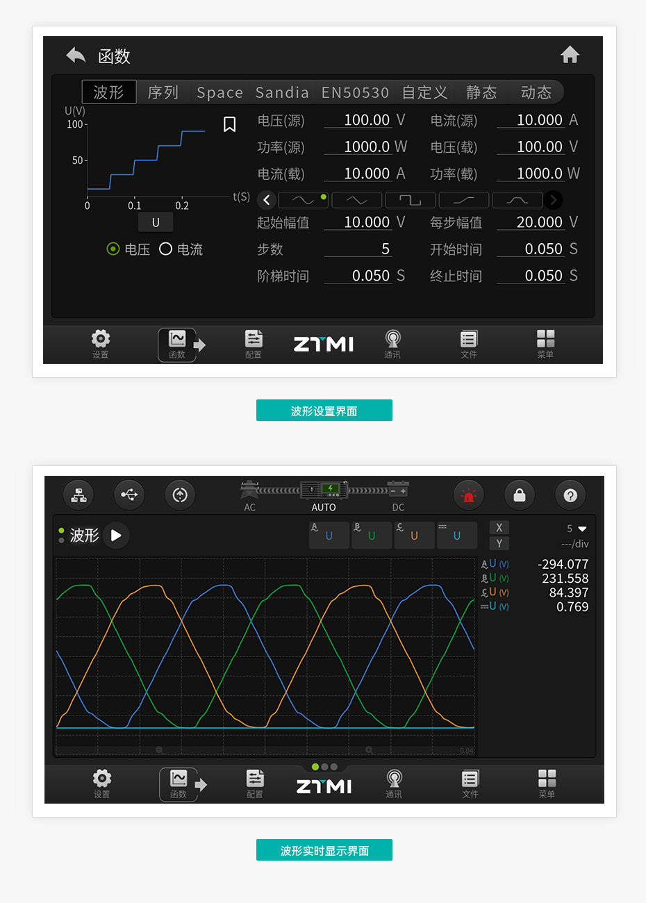 PSD8000 将“效率为先”融入产品设计。设备波形库内置丰富的常用测试波形,用户可以通过拖动的方式快速将各类波形进行序列编程,界面下方会直观的展示序列变化;点击输出后,界面将自动切换为波形实时显示界面, 可以显示 U、I、P、R 等参数。如此可将波形设置及波形显示深度串联,令测试更加流程化。