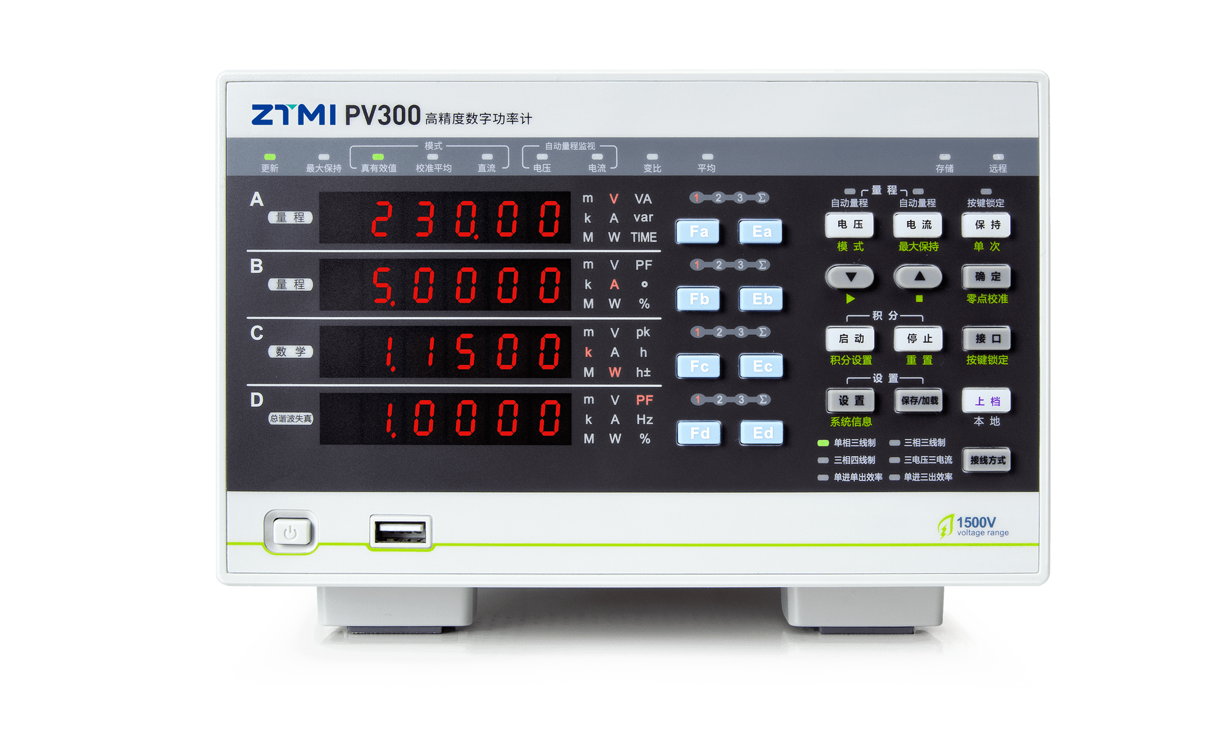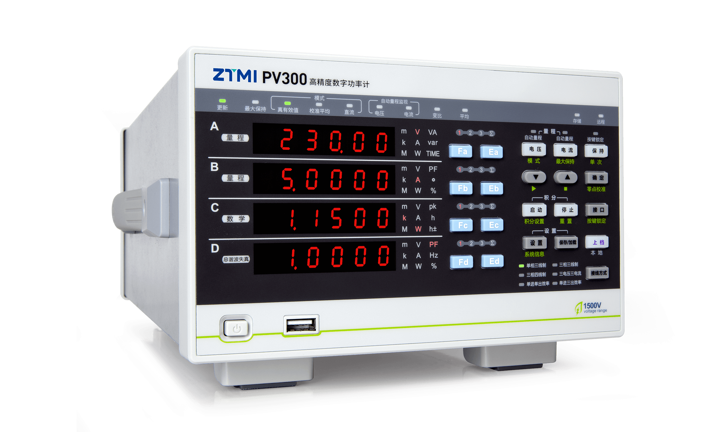 PV300高精度数字功率计,具有0.1%的功率测量精度,可满足用户50A大电流的测量需求;并采用DSP + FPGA 双核处理架构,快速、精确地计算信号各相参数,同时具备以太网、RS-232、USB、GPIB等接口满足用户不同的系统集成测试通信需求。