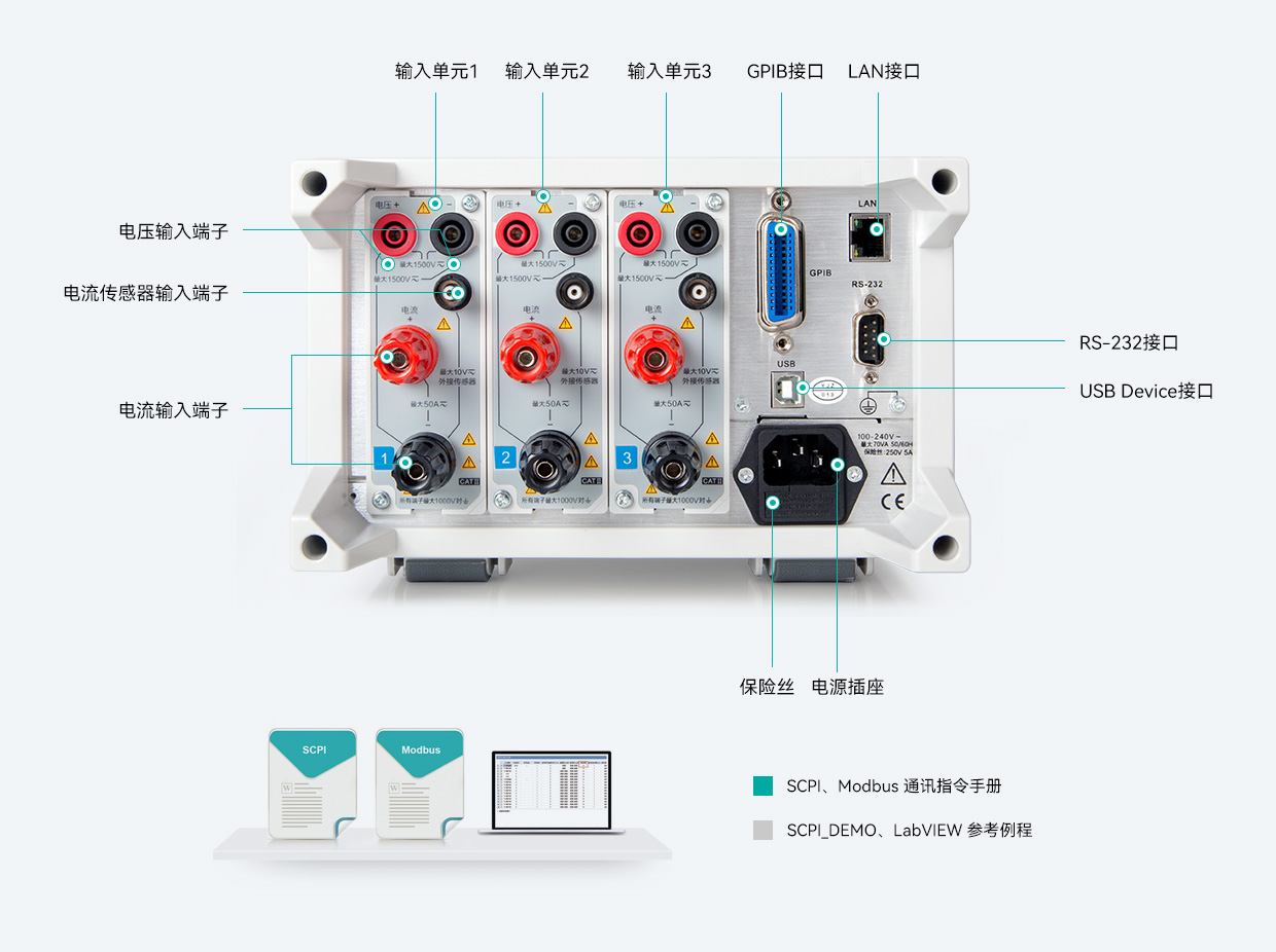 通讯接口是数据通讯的硬件基础。PV300功率计标配LAN、GPIB、RS-232和USB Device接口,兼容SCPI、Modbus两种通讯指令,保证了测试设备在自动化产线测试的系统集成中具备良好的兼容性。