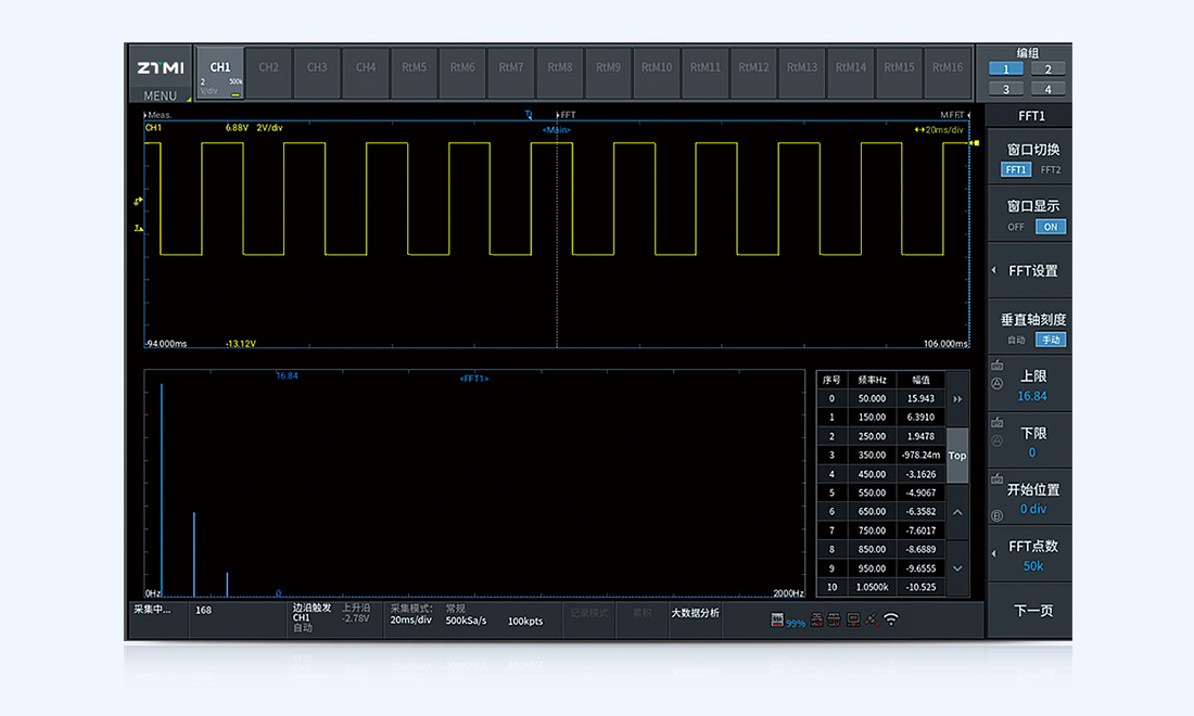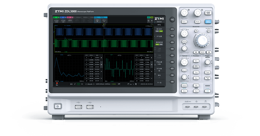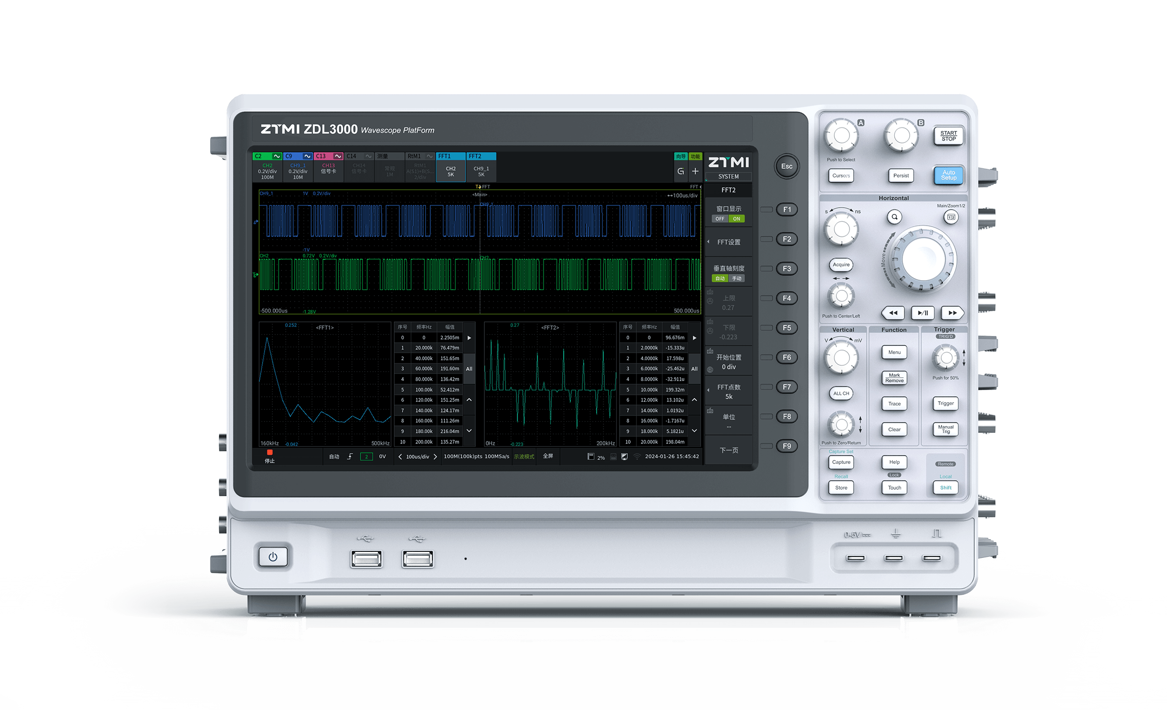 ZDL3000最高可通过100K点的FFT对信号进行频谱分析,此功能不仅可以完成对频域的定量分析,还支持频谱查看和数值的实时查看与存储。进一步还能使用光标对峰值进行自动捕捉。