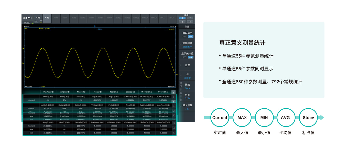 如果工程师用惯了示波器的参数测量统计功能,不用担心,它被完全移植进入ZDL5000,共55种参数测量统计可以满足绝大多数工程师的使用要求。