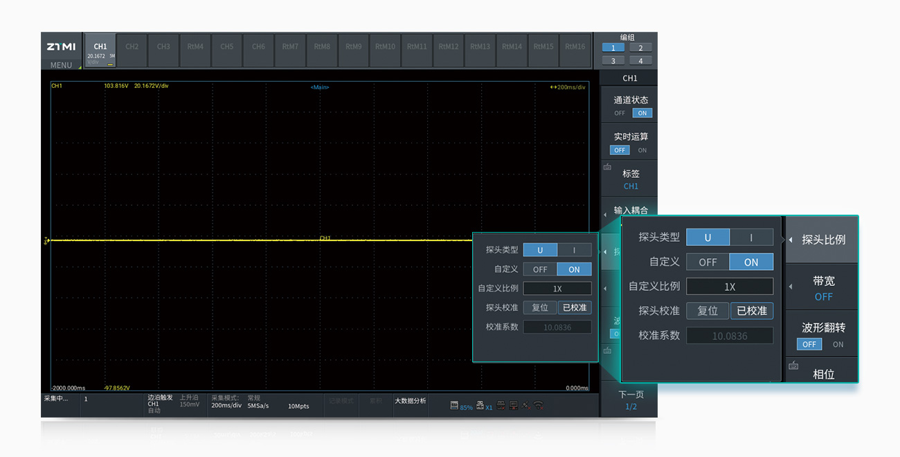 在测量大电压和大电流时,ZDL3000往往需要配备高压差分探头和电流探头,有时传感器的出厂放大比例和实际会有差别,为了提升整体测试精度,ZDL3000加入了探头比例校准和延时修正功能,确保系统整体测量精度。
