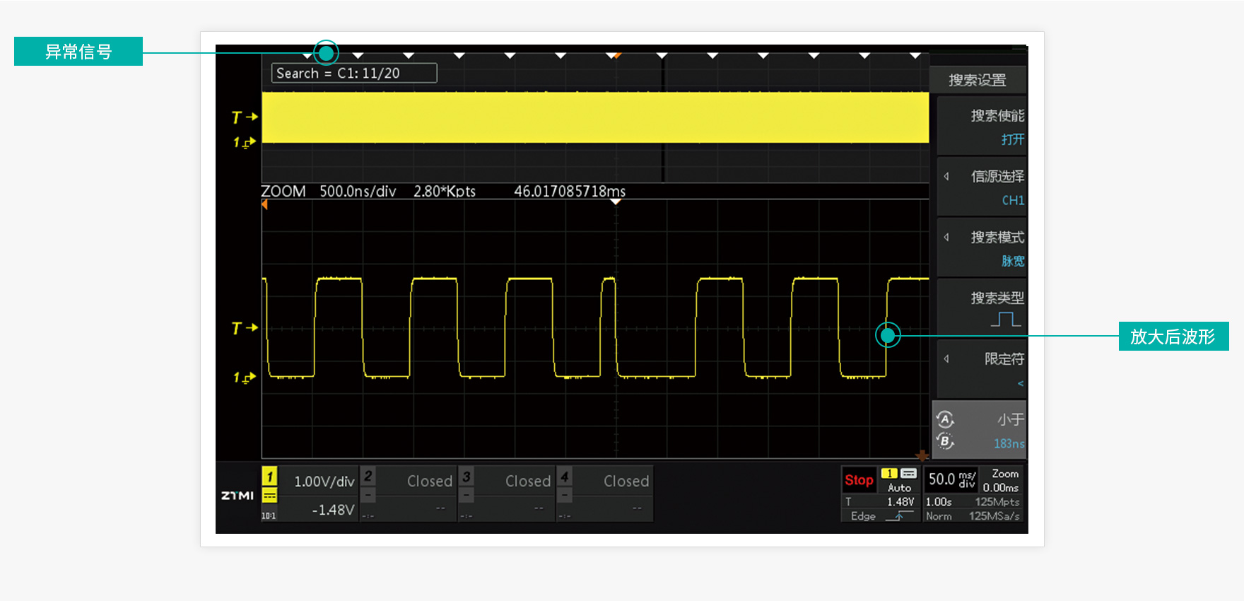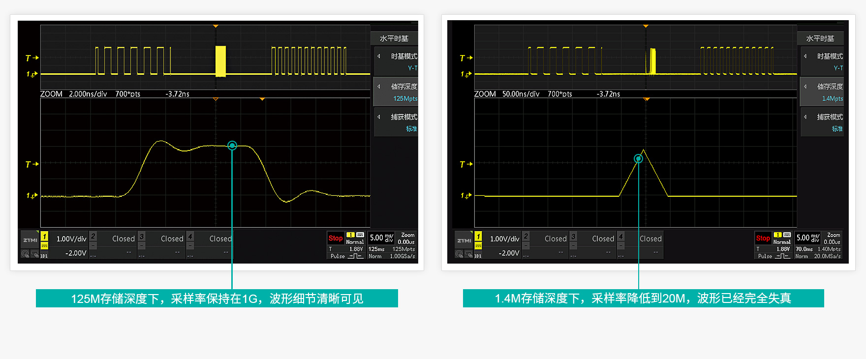 如果存储深度不足,高采样率的情况下只能捕获一小段波形,ZDS2024C标配125Mpts存储深度,保持1GSa/s采样率的情况下,依然可以捕获125ms波形。
