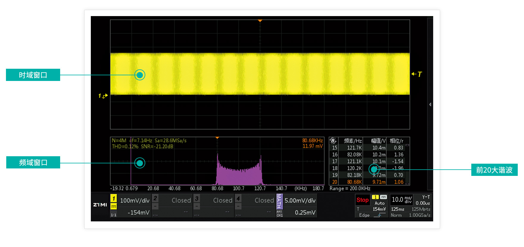 市面上多数示波器最大只支持8K样本点的FFT分析,在1G采样率的情况下,频率分辨率仅有125KHz,多数情况都无法准确判断信号频谱分布。ZDS2024C示波器拒绝单纯的功能堆砌,内部采用了专业的处理芯片,突破技术壁垒,将FFT点数升级至4M样本点,同样在IG采样率的情况下频率分辨率能精确到250Hz,可以准确分析出电路中的干扰噪声来源,大大提高了示波器FFT的实用价值。