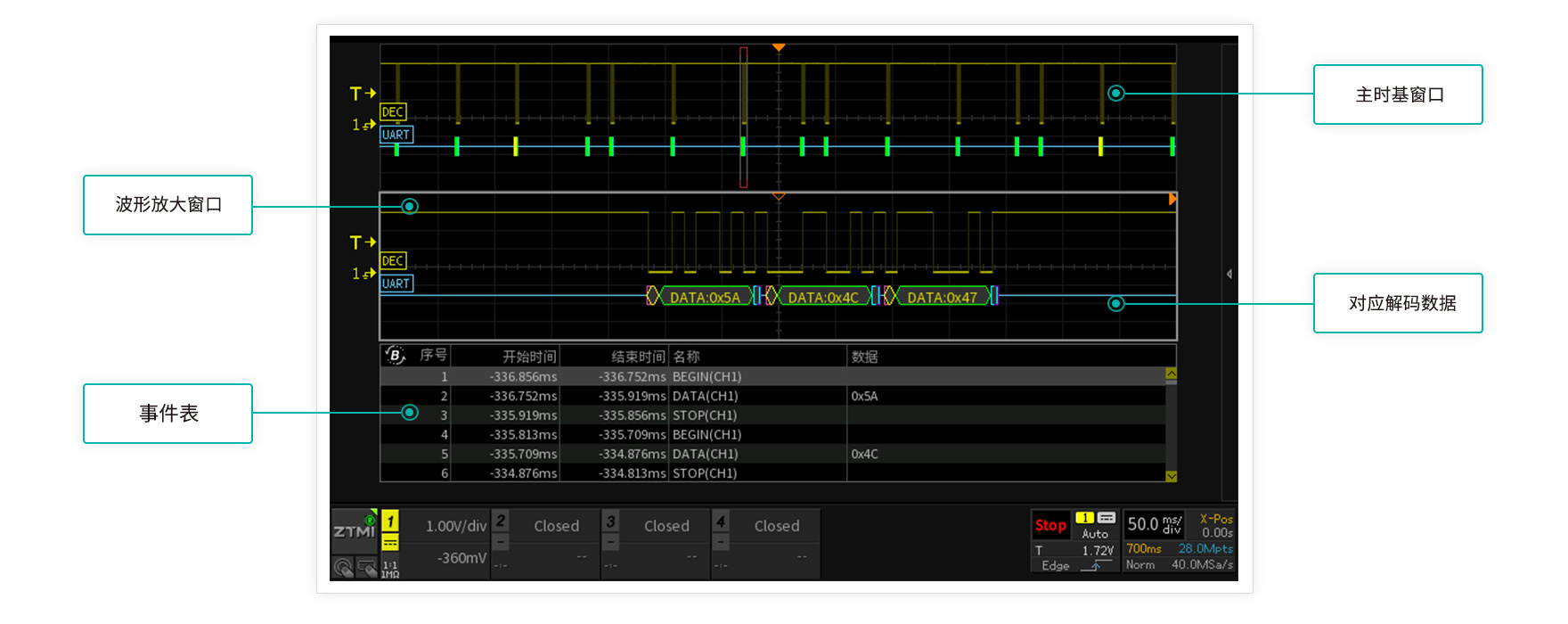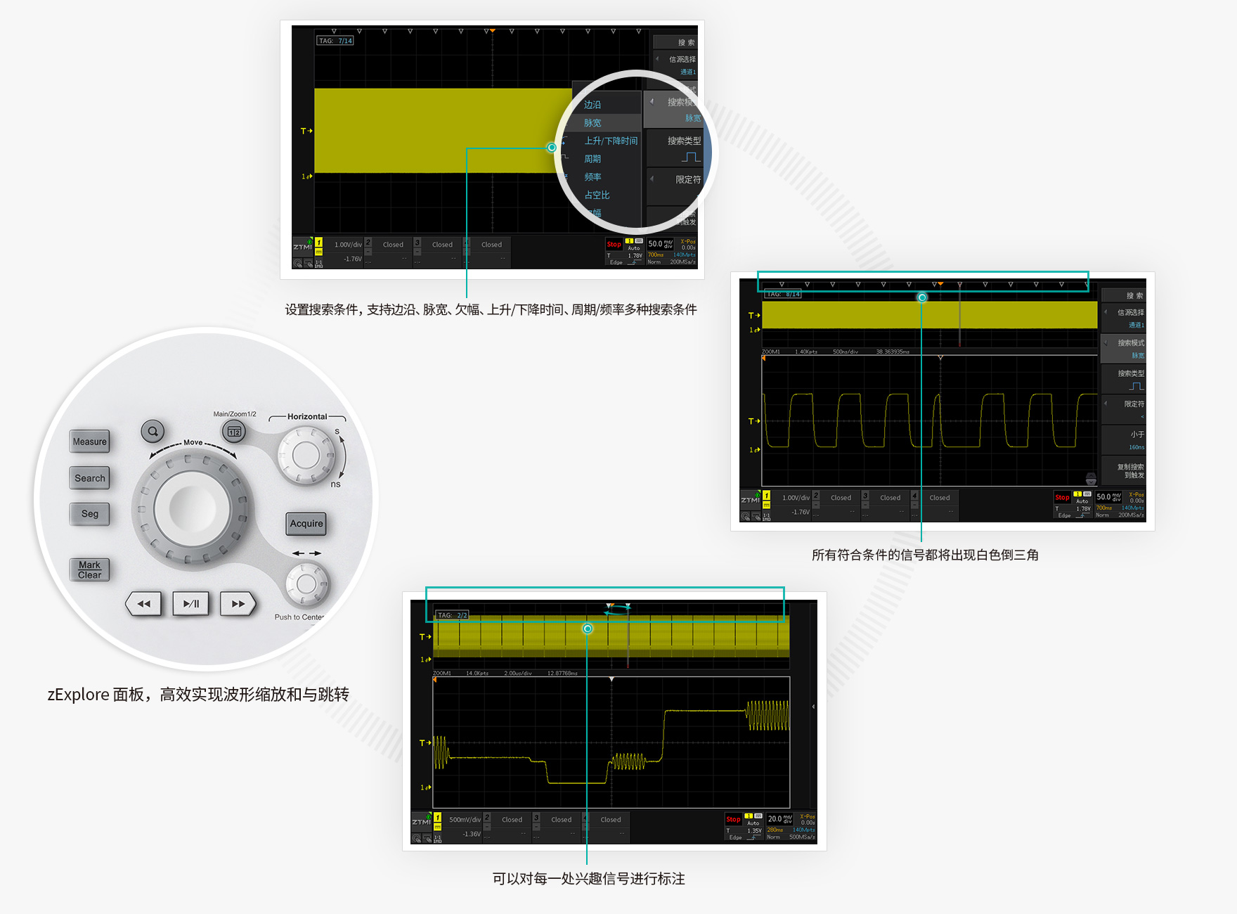 ZDS4000系列示波器不只提供了512M的波形大数据,还配有强大的波形搜索功能和智能标注功能。您可以先通过边沿、脉宽、欠幅、上升/下降时间、周期/频率等多种搜索条件来定位512Mpts波形数据中的异常点,再对找出的异常信号使用标注功能,对异常信号进行标注。这里,所有的测量都是经过FPGA全硬件加速,整个过程1S左右即可完成。再对找出的异常信号使用标注功能,对异常信号进行标注。