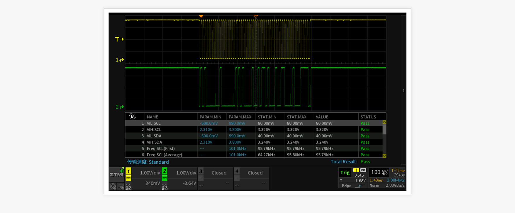 ZDS4000系列示波器免费标配时序分析功能,支持自定义参数配置对I2C、I2S、SPI、MIPI-RFFE、CAN、Reset、Switch进行分析处理。自动分析多个波形中最差情况是否满足标准,可直接筛选某个特定节点并直接生成附带截图的报告。