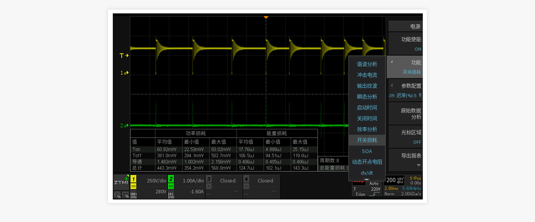 开关电源的质量直接影响到产品的技术性能以及其安全性和可靠性。电源测试项目多,计算量大,统计繁琐等问题一直困扰着工程师们,为了解决这些问题,致远电子在示波器中增加开关损耗、SOA、电感测试等电源分析功能。如在电感测试功能中可直接对电感、有功功率等项目进行计算,方便工程师快速、准确地测试电源产品。