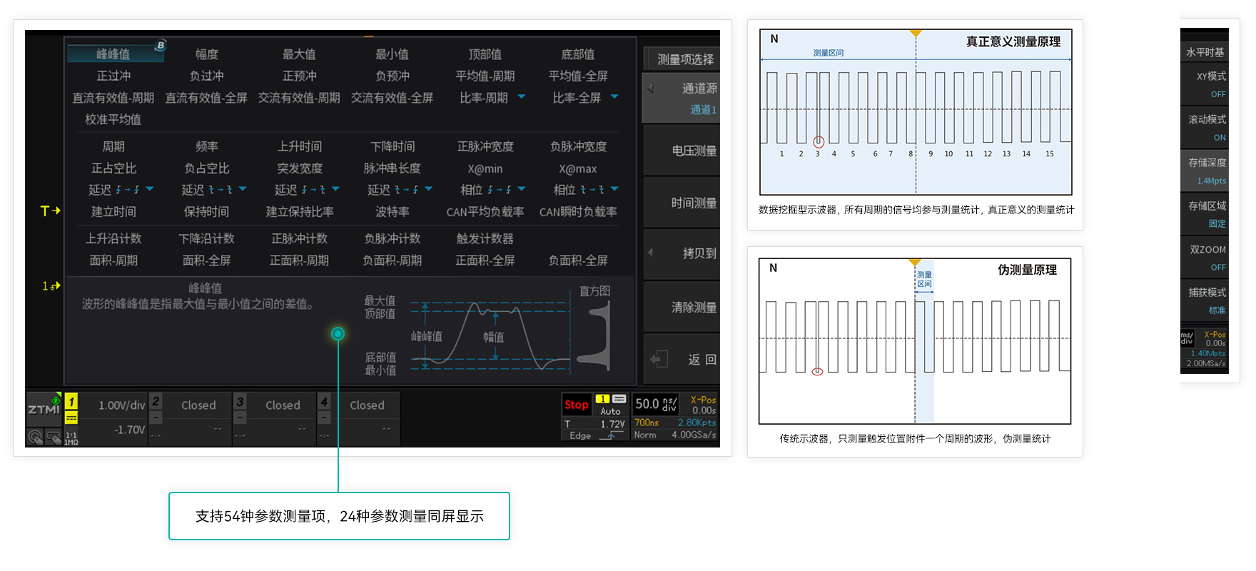 不同于传统示波器只测一个周期,或通过抽样减少数据量再测量的模式,ZDS4000系列示波器通过FPGA全硬件并行处理,基于原始采样率和512Mpts全存储深度,对每一帧波形每一周期进行测量统计,仅需约1秒即可实现对512Mpts数据的“真正意义”参数测量,测试项目可达50余种,并且支持24种参数同时显示。这与传统意义示波器的测量有着本质的区别,也是示波器测试手段与测试方法的突破。