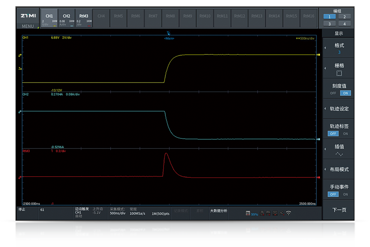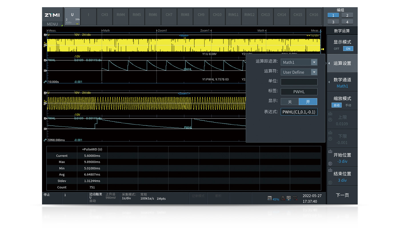 ZDL6000和ZDL5000示波记录仪允许用户通过自定义公式对屏幕中的波形进行数学运算,数学运算的结果将以波形方式进行呈现,用户还可以对数学运算的波形进行二次分析。