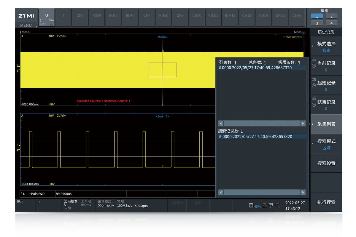 ZDL6000和ZDL5000示波记录仪客户不仅可以保存历史5000屏的数据,还可以针对5000屏的数据进行历史搜索,用户可以快速定位异常信号。