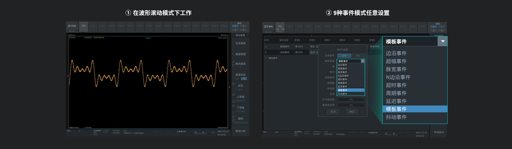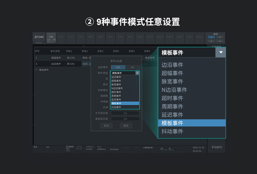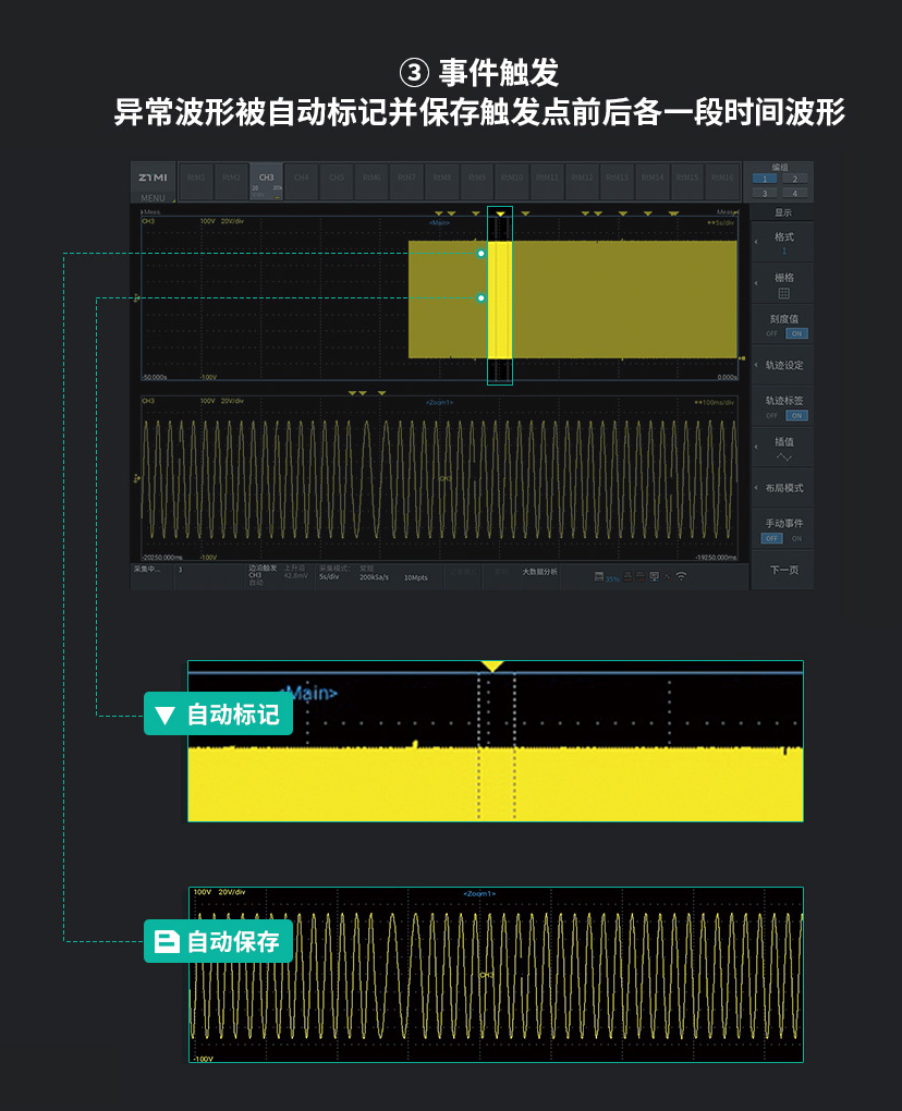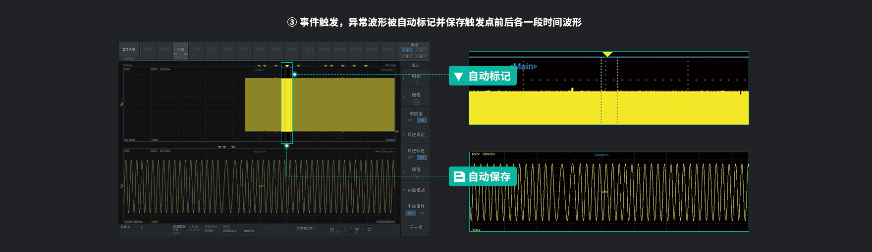 实时事件是ZDL6000示波记录仪最先进的功能,这是一种可以使示波记录仪运行在波形滚动模式下无死区地对波形进行实时条件判定的功能,当满足触发条件时,可对触发点前后各一段波形进行数据存储,大大节省存储空间和查找异常波形的时间。