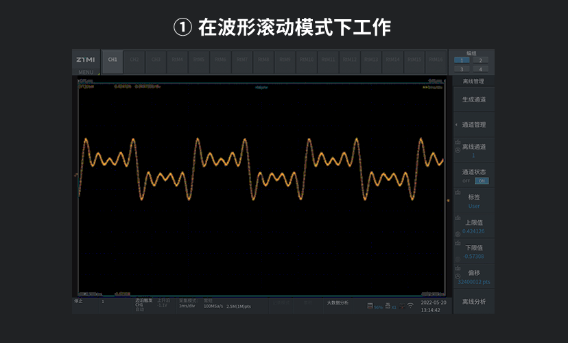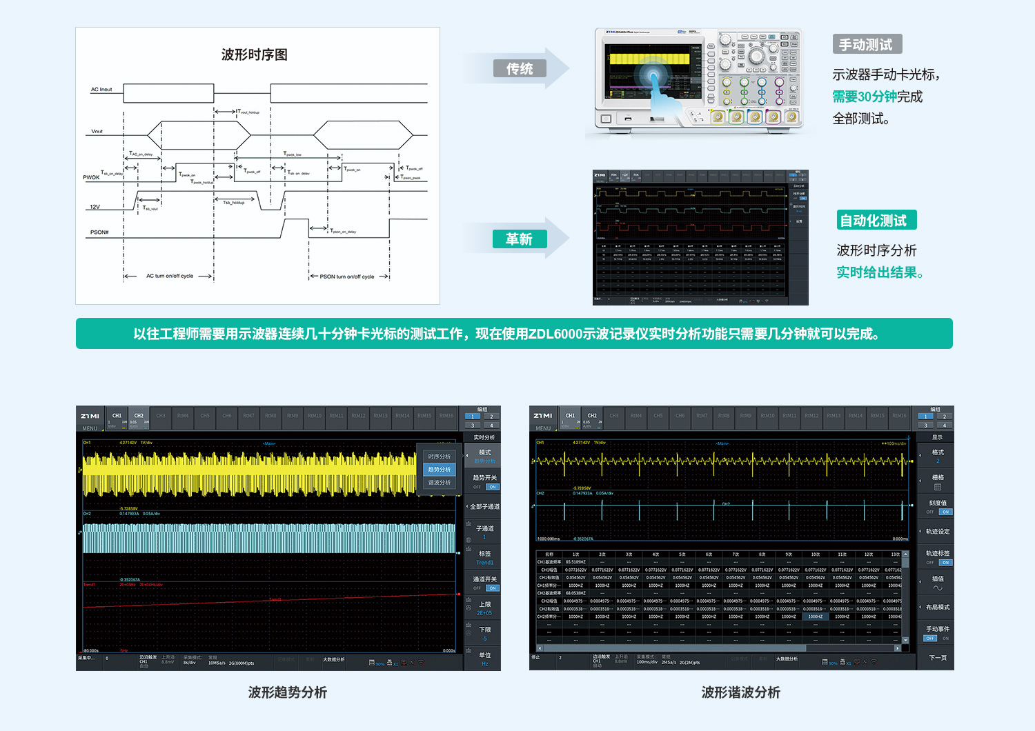 实时分析是ZDL6000示波记录仪最智能的功能,它可以在滚动模式下实时对屏幕中的波形进行分析运算,它可以帮助用户在长时间的重复性测试中,以自动化的机器测试代替重复性的人工测试,大大提高了测试效率。实时分析功能包含了波形时序分析、波形趋势分析以及波形谐波分析。