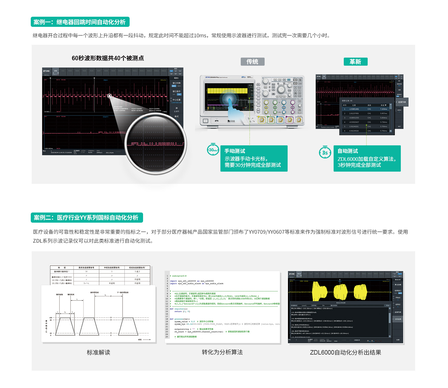 大数据分析是ZDL6000示波记录仪最灵活的功能,他打破了传统仪器在设计时只保有固定的分析方法和触发方案,大数据分析允许用户加载自定义的分析算法,尤其是面对固定的测试标准(典型如国标测试、IEC标准等)或者有规律的测试方法时,它将可以大大提高数据分析的效率。