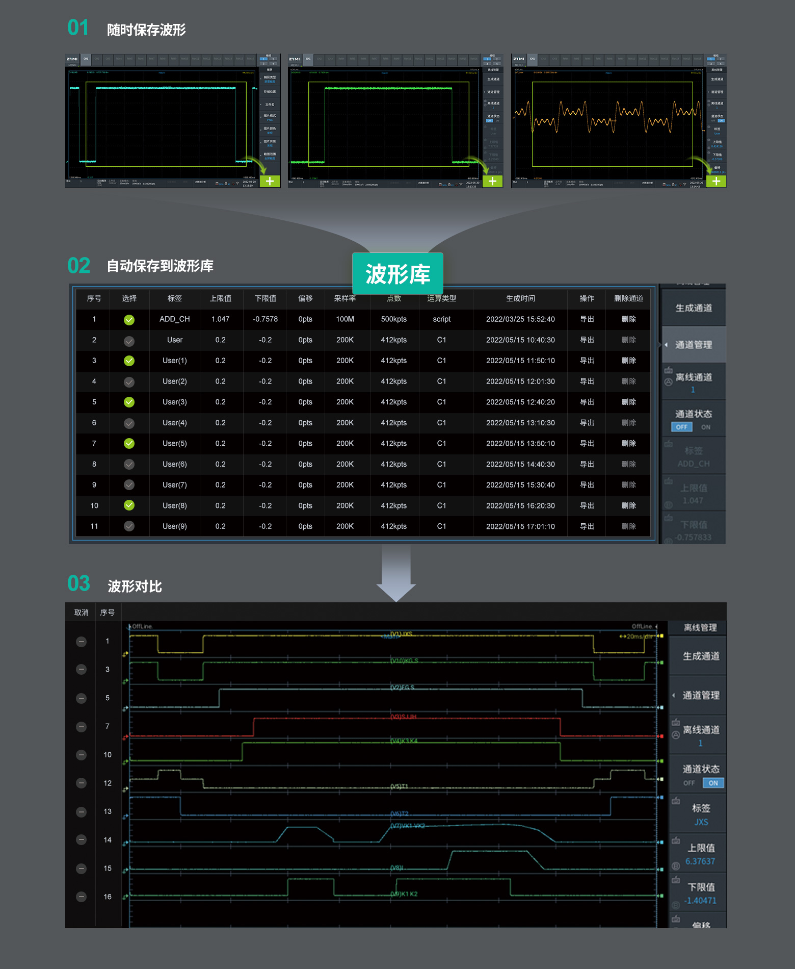 波形对比功能是ZDL6000示波记录仪最具创意的功能。它允许用户随时随地的保存屏幕中的波形到波形对比库,用户可以方便的将所有保存的波形进行对比分析,观察波形走势以及差异化。