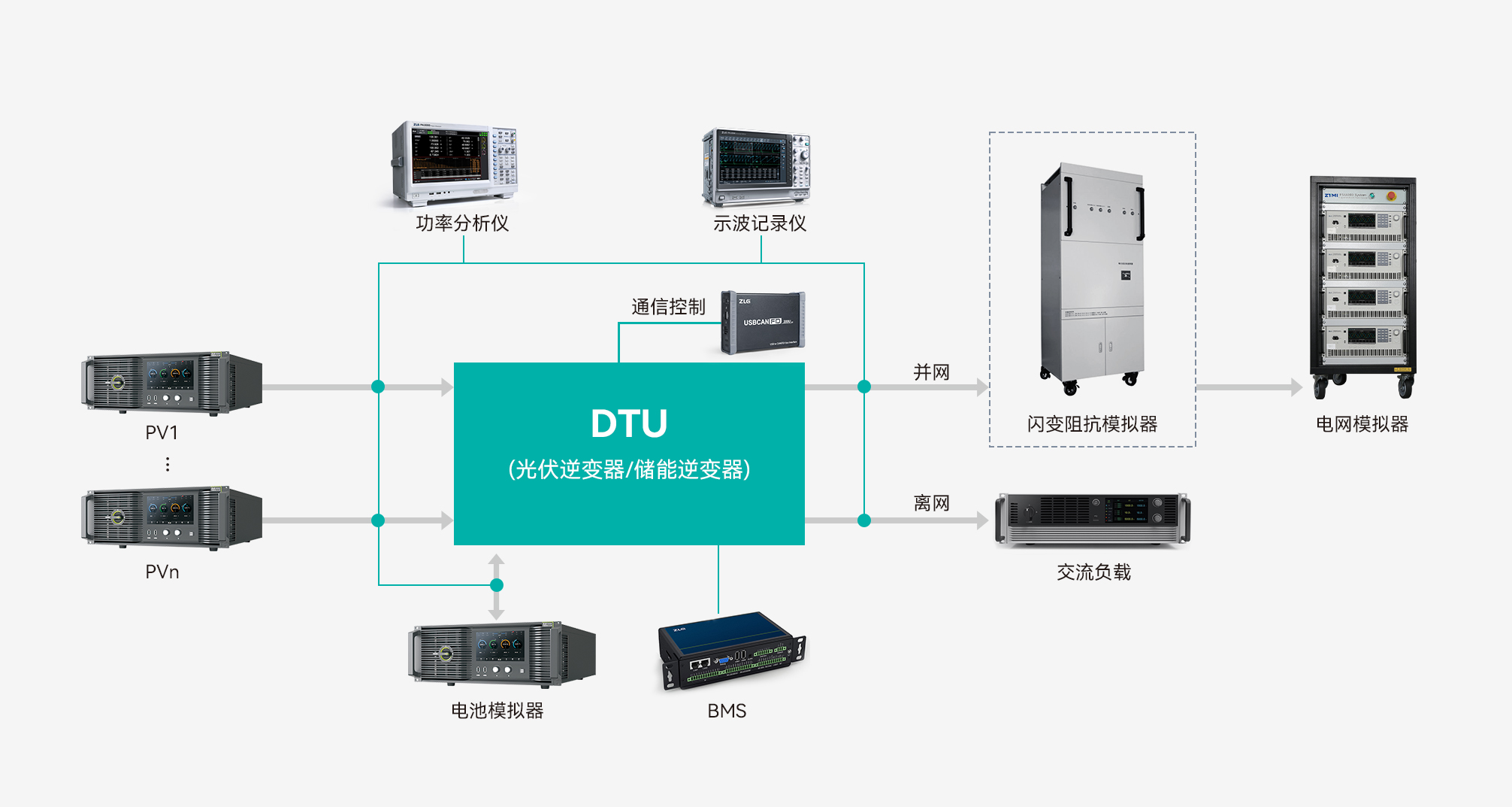 MPT 智能化光伏/ 储能测试系统是针对光伏逆变器及储能逆变器实现性能测试、特性测试、并网测试与标准认证的自动化测试平台,可支持多国家认证标准。系统由PV光伏源、电网模拟器、闪变阻抗模拟器、交流负载、电池模拟器、功率分析仪、示波记录仪、自动化控制机柜及自动化测试软件等组成。