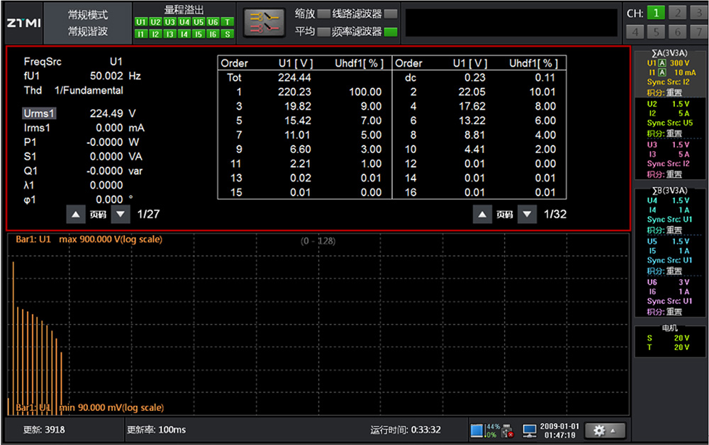 常规谐波测量: 在该测量模式下,可同时使用积分、波形显示、趋势显示和效率运算等功能,并测量带宽内所有频率成分的电压/电流有效值,如图所示,为常规谐波测试;