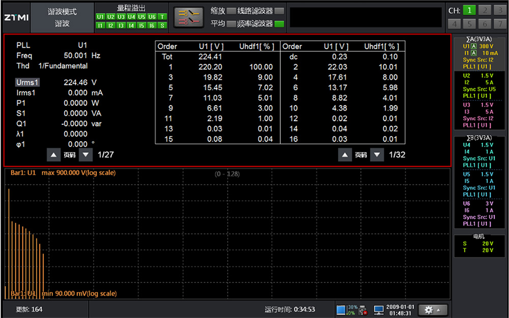 谐波测量: 在该测量模式下,可对1kHz基波频率信号进行多达255次的谐波测量,拥有PLL源进行校准,对基波频率高于商用电源频率的信号进行谐波测量时,须使用该模式,如图所示,为谐波测试;