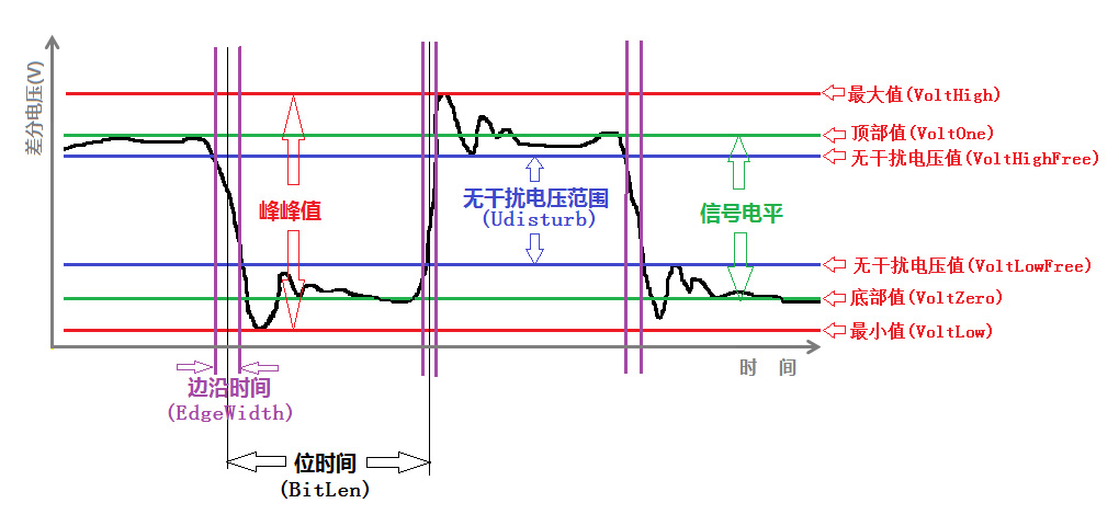 无干扰电压范围(Udisturb):是指待评估差分波形段中显性位电平的最小值和隐性位电平的最大值之间的差值。