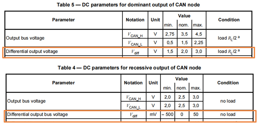 信号质量的好坏与信号的幅值(幅值是指顶部值与底部值之间的差值)密切相关,而CAN差分波形对应的顶部值和底部值应满足ISO 11898-2标准,否则可能出现CAN通信异常的现象。