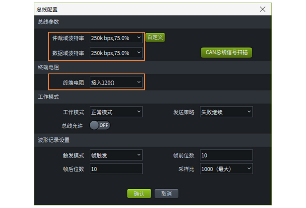 第二步,设置波特率、终端电阻及工作模式等;