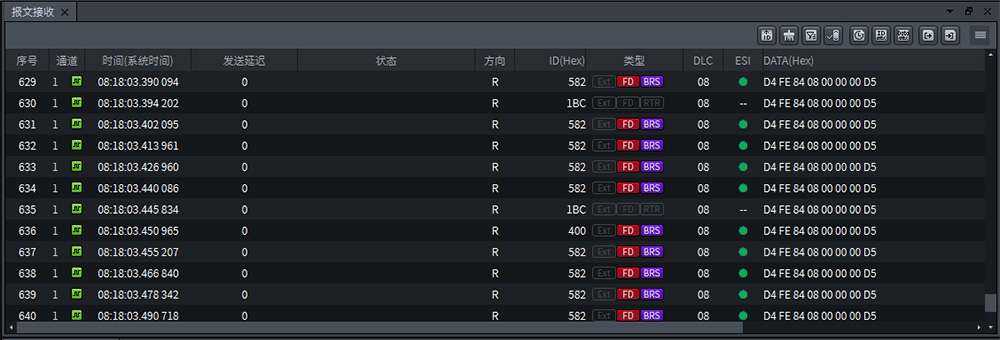 第三步,开启ZPS软件中的CAN1通道按钮,采集一段时间DUT发送的报文;