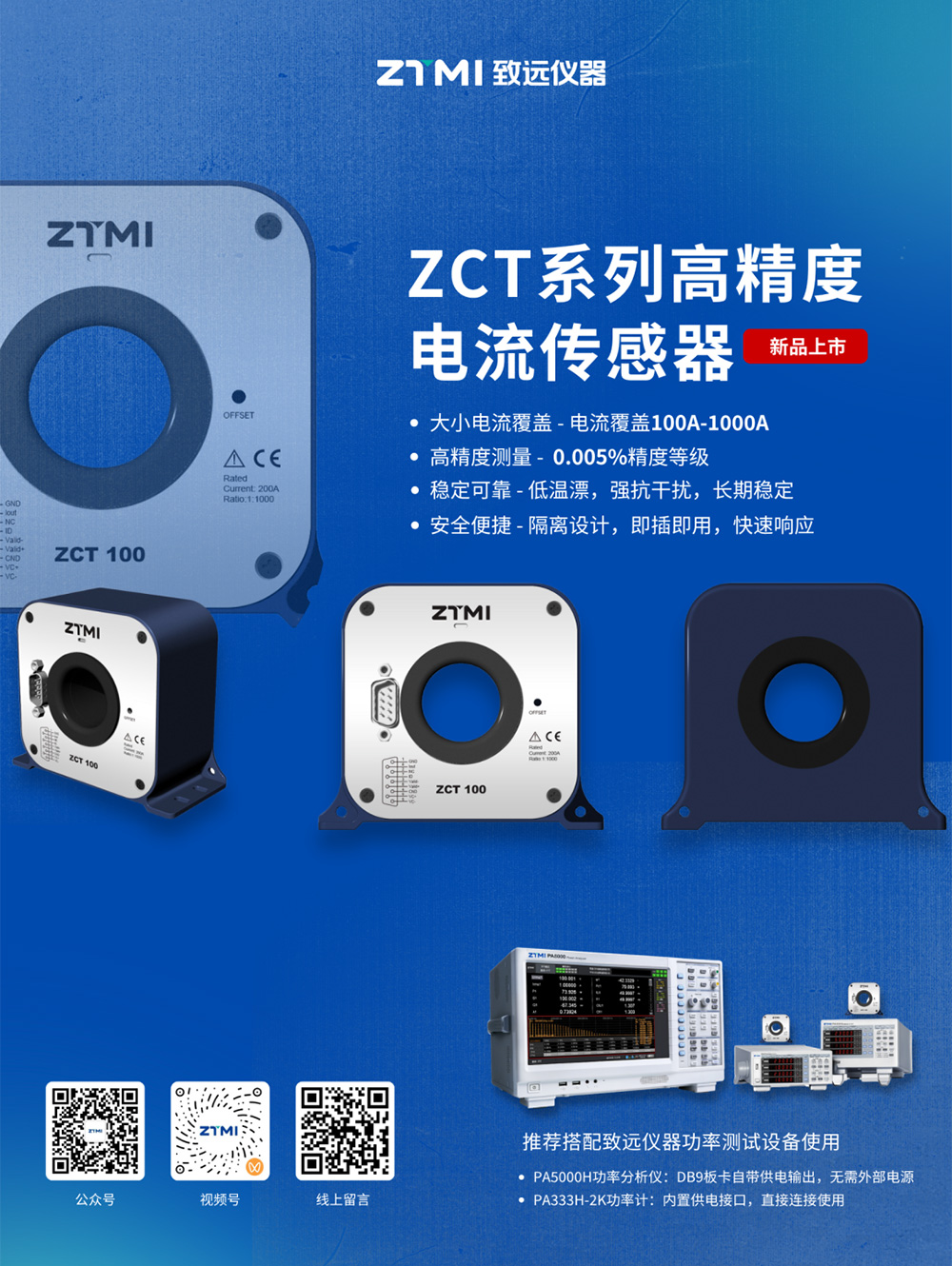 ZCT系列主要配合功率分析仪和功率计实现大电流测试,推荐与致远仪器PA系列高精度功率分析仪和PA300系列高精度功率计搭配使用。