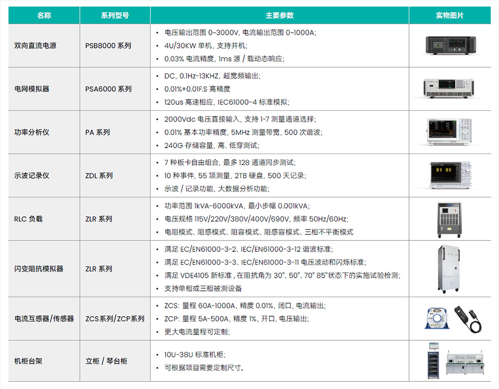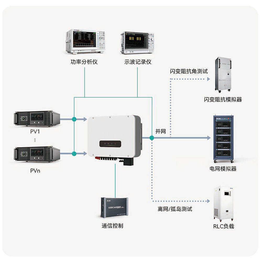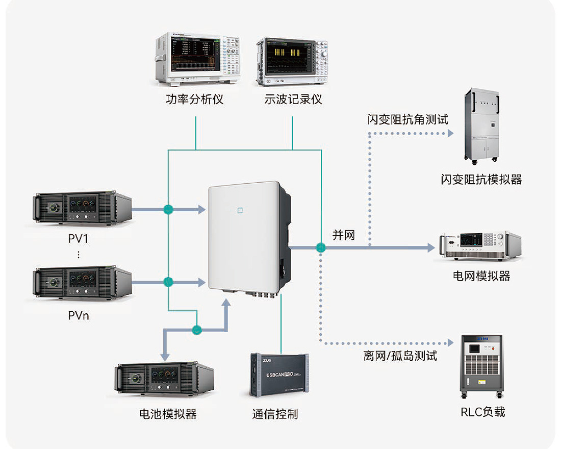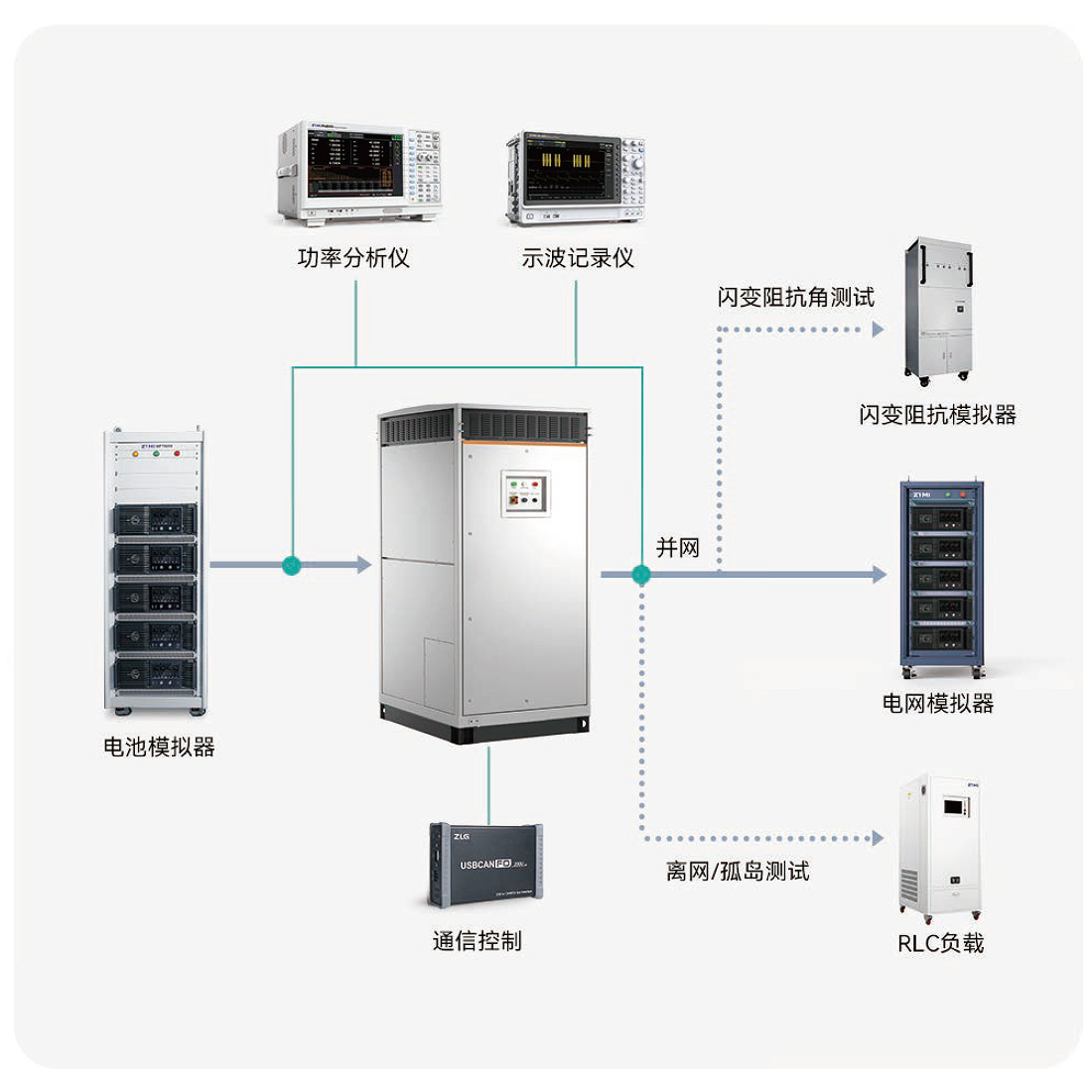 系统主要由PV光伏模拟源、电网模拟器、闪变阻抗模拟器、RLC负载、电池模拟器、功率分析仪、示波记录仪、自动化控制机柜及自动化测试软件等组成,从定制系统架构、专业硬件平台、智能软件中心全方位提供高标准测试服务。