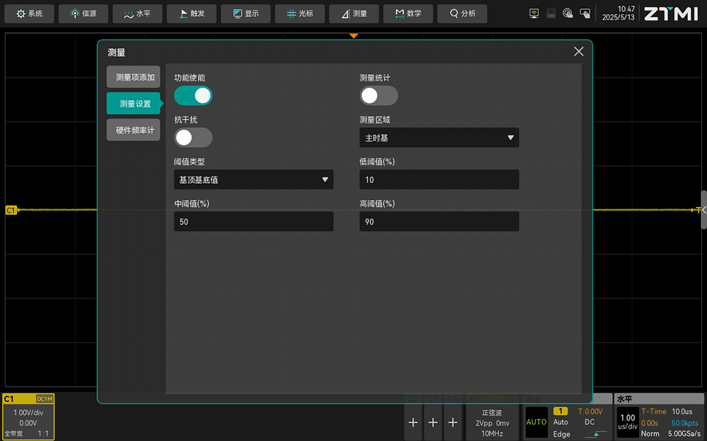 在致远仪器的示波器中,低阈值、中阈值、高阈值分别默认为10%、50%、90%,如图1所示为ZUS5054Pro的阈值设置界面。需要注意的是,由于趋势图与参数测量和波形搜索三者的测量项的阈值共用一个,改变任何一处的阈值,其他均会跟着改变。