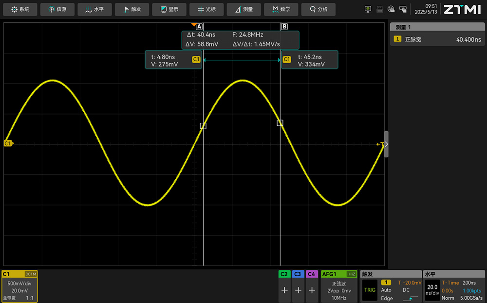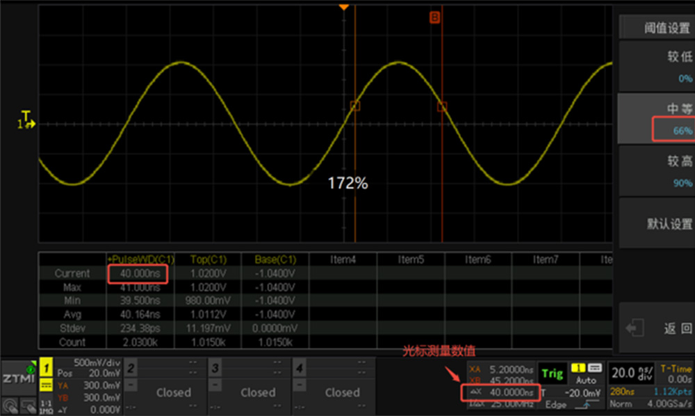 4. 手动修改后打开参数测量的正脉宽测试项(+Pulse)可以得到均值为40ns,用光标进行手动卡值的数据为40ns,两个数值差异不大