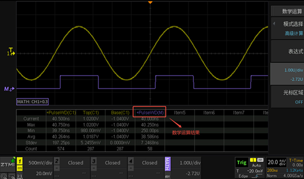 3. 读取数学通道的测量项中的最大值为40ns,与光标值差异不大