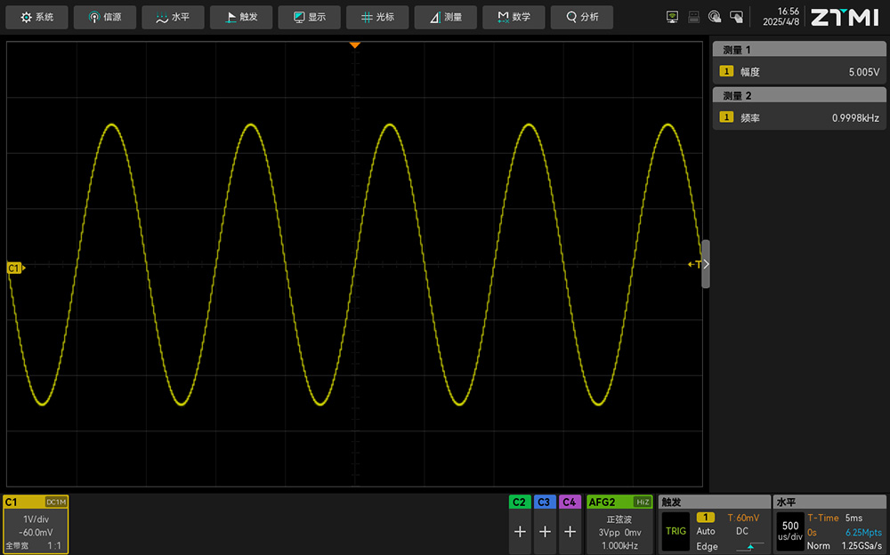我们用信号发生器输出一个频率1KHz,幅度为5Vpp的正弦波,滚动模式下观察波形我们不放大发现两者波形几乎一模一样:
