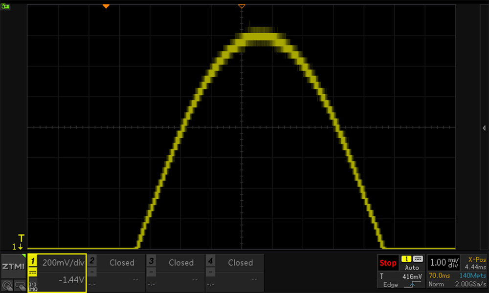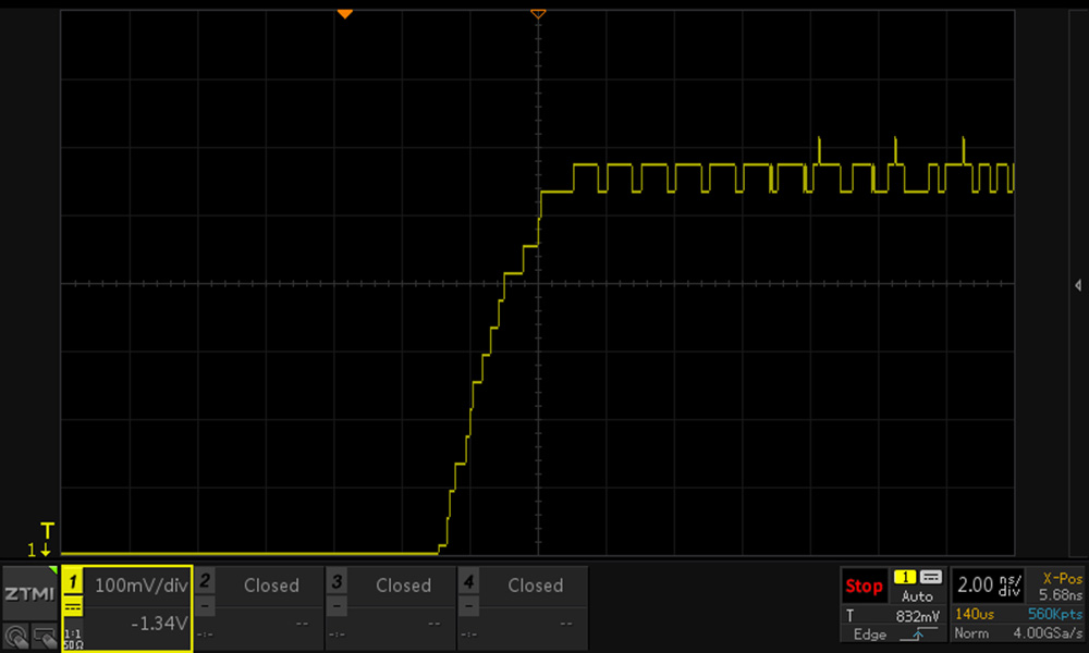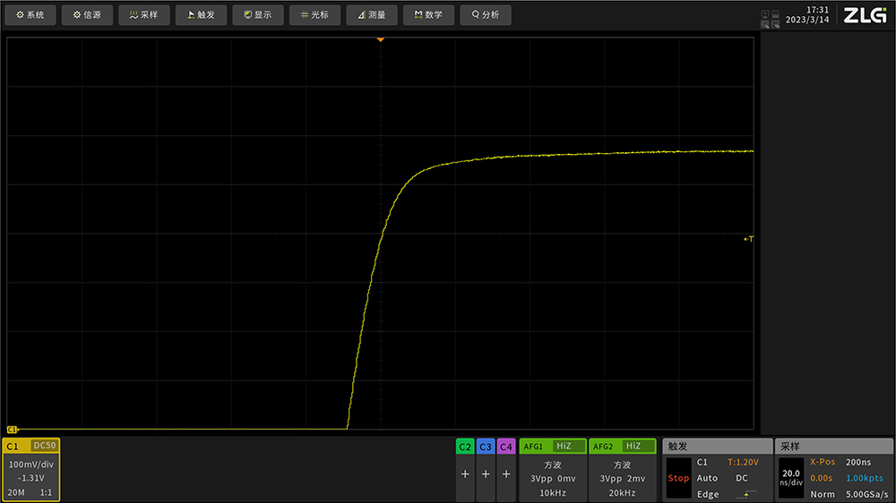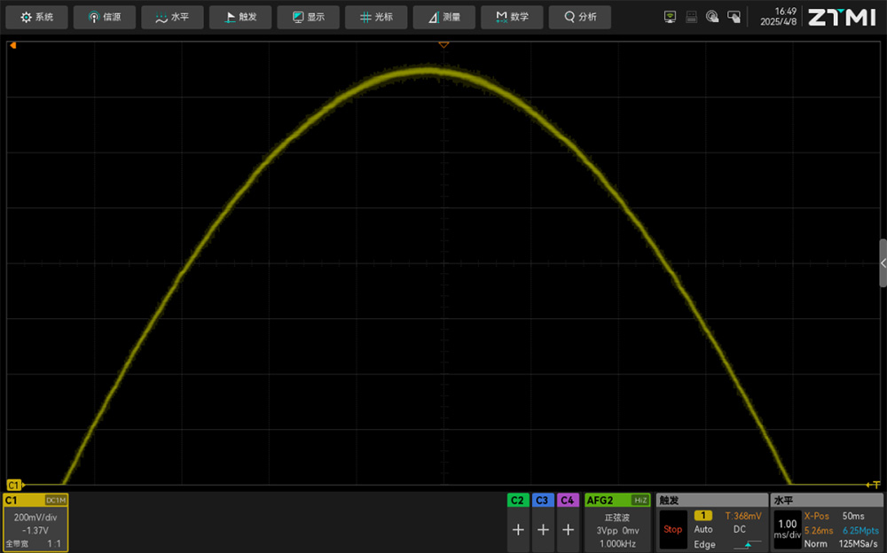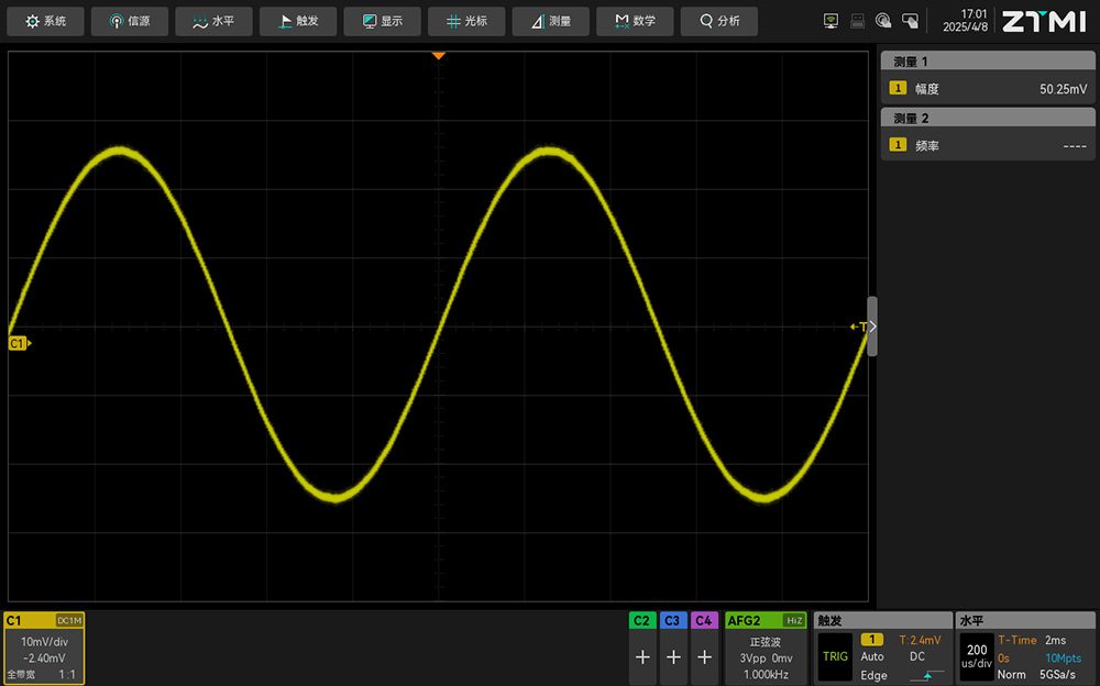 致远仪器ZUS5054Pro示波器采用12bit高速ADC,垂直分辨点数达到4096点,测量精度达到0.5%,是普通8bit示波器的16倍。ADC位数越高,示波器垂直分辨率越细,ZUS5000更精细的垂直分辨率,可以让我们看到更真实的波形细节。