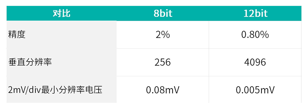 这意味着在相同的电压量程下,12bit示波器的分辨精度比传统8bit示波器提高了16倍。