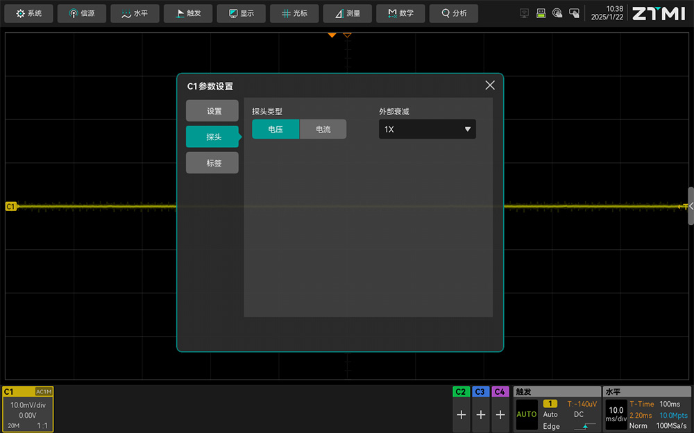 示波器通道阻抗有1MΩ和50Ω两种选择。使用无源探头时,通常选择1MΩ。同时,探头要选择合适的挡位,电压较大或者对带宽要求较高时,可使用X10档;普通情况下建议使用X1档,以减少纹波测量的影响。示波器通道的衰减比也要调成相应的档位。