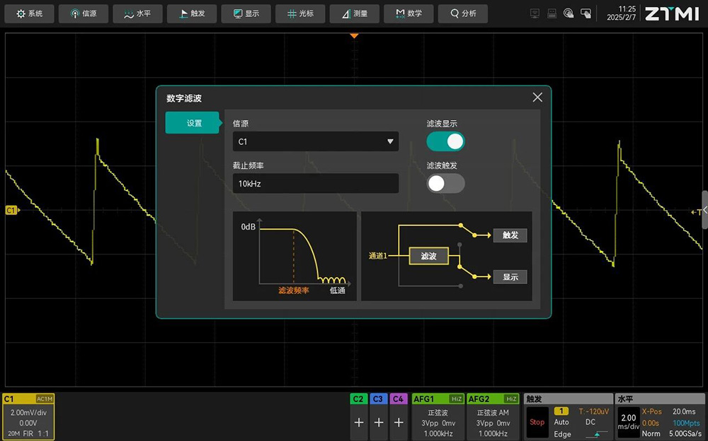 从图8中可以看出,正确的纹波测量方式可以清晰地捕抓到正常的纹波,减少了不必要的噪声和杂波对纹波的影响。但是遇到噪声较大的情况时候,可以用到我们示波器的FIR滤波功能进行灵活设置频点来滤除不必要的噪声,得到的波形基本上就是一条干净的纹波。