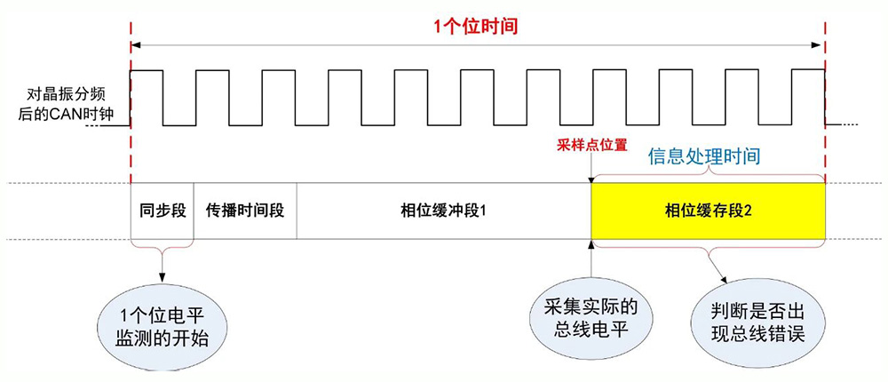 如图2描述,CAN控制器监测一个总线电平的电平值是在采样点位置进行的,判断是否出现错误是在信息处理时间内完成的。