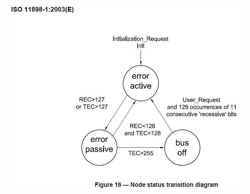 1、由于篇幅有限,关于错误计数的详细规则、节点状态转换以及错误帧格式等细节均不在本文进行讨论,请读者查阅CAN协议规范。
