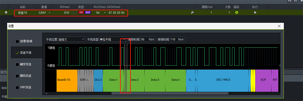 在"主动发送干扰"功能中,我们可以自定义发出报文结构、错误类型等,可任意模拟任意一帧报文的任意位置,如下图,可以把将要发送的报文任意位置(即灰色选中区域)干扰为反相位,以达到发送错误报文的目的,从而验证芯片在接收到错误报文后的动作机制。