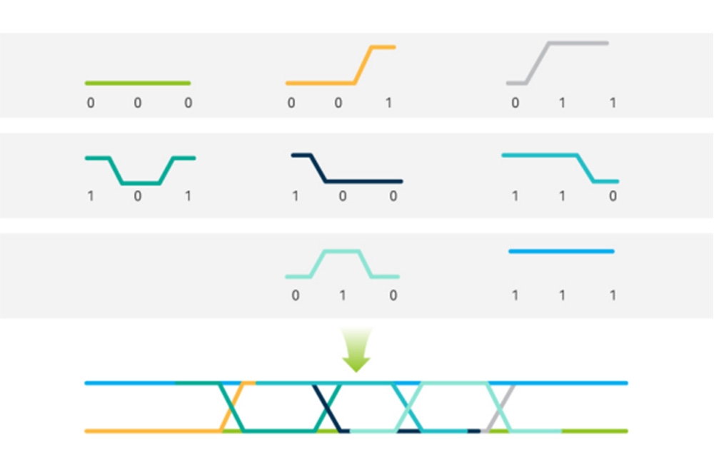 眼图测试并非随机的波形采样,而需覆盖信号的所有状态组合。以3个比特的逻辑状态为例,二进制从“000”到“111”共有8种可能的组合。