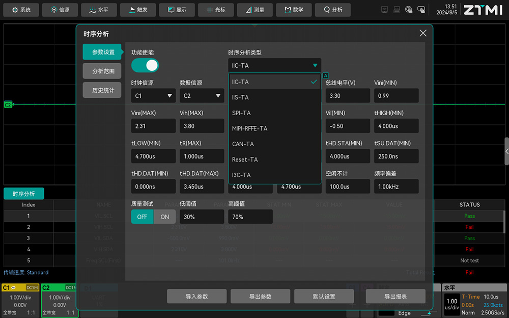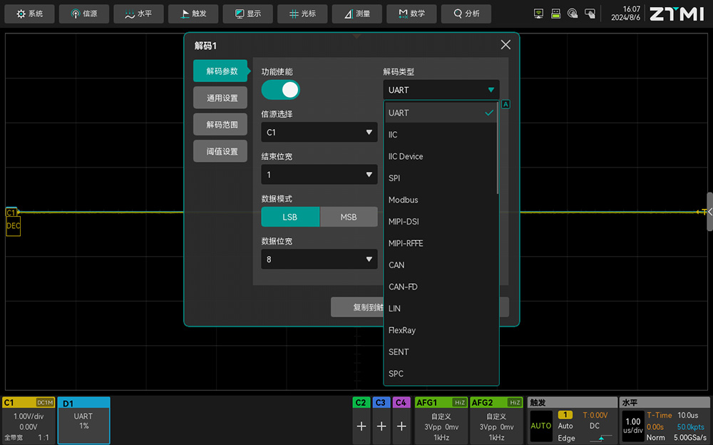 A3:是的,ZUS系列示波器支持包括MIL-STD-1553B在内的40余种工业与航空通信协议解码,适配各类工业巡检、特殊领域无人机系统的信号监控需求。