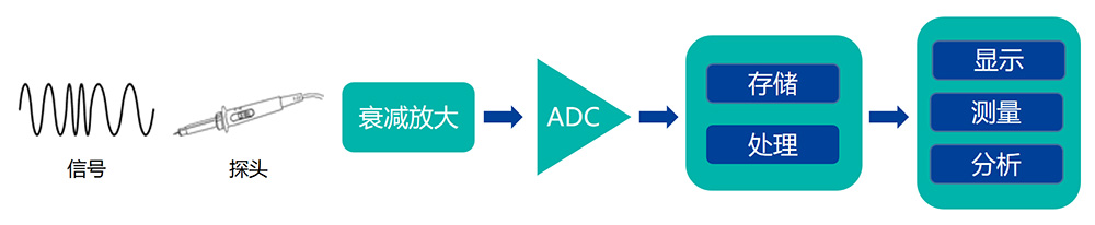 示波器的信号采集链路由探头输入、衰减放大、ADC模数转换及数据处理组成。其中,ADC(模数转换器)是决定采集质量的核心器件。